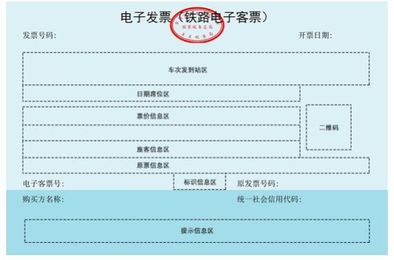 二、电子发票(铁路电子客票)属于全面数字化的电子发票,基本内容包括:发票号码、开票日期、购买方信息、旅客身份证件信息、行程信息、票价、二维码等。电子发票(铁路电子客票)样式见附件1。