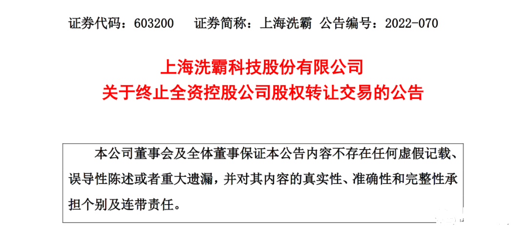 2022年12月22日晚间,上海洗霸科技股份有限公司(证券代码:603200,证券简称:上海洗霸)发布了《关于终止全资控股公司股权转让交易的公告》称:2021年12月9日,本公司全资控股公司上海洗霸公诚环境有限公司与北京九廷城环科技发展有限公司签署《股份转让合作协议》,约定公诚环境向九廷城环转让持有的浙江博笃科技有限公司100%股份,转让价格为人民币14,600万元。《股份转让合作协议》签署后,双方及时设立了共管账户,但相关交易方案始终未能得到土地监管部门的明确支持,加之其他多种因素的综合影响,协议项下主要内容至今尚未履行。2022年12月21日,经公诚环境与九廷城环审慎协商一致,决定以《约定书》方式终止前期签订的《股权转让合作协议》。