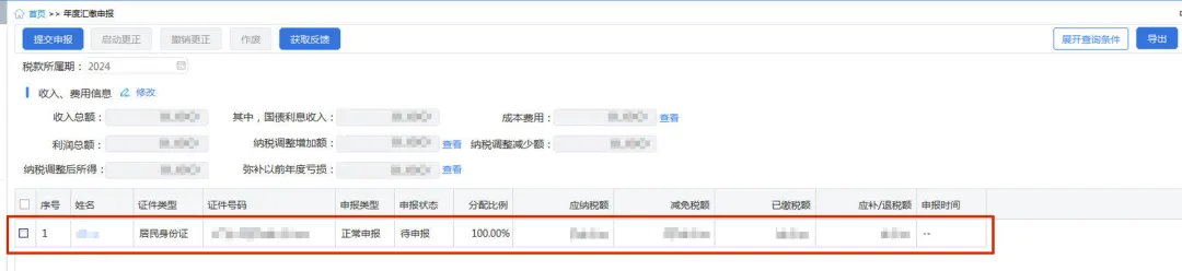 6、确认投资人纳税信息填写无误后,选中未申报数据,点击【提交申报】-【获取反馈】,查看申报状态。