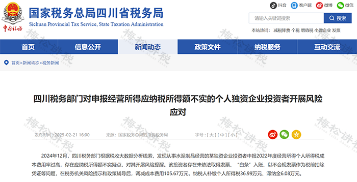 2024年12月,四川税务部门根据税收大数据分析线索,发现从事水泥制品经营的某独资企业投资者申报2022年度经营所得个人所得税成本费用率过高,存在应纳税所得额不实疑点,对其开展风险提醒。该投资者存在未依法取得发票、“白条”入账、以不合规发票作为税前扣除凭证等问题,在税务机关风险提示和政策辅导后,调减成本费用105.67万元,纳税人补缴个人所得税36.99万元、滞纳金6.08万元。
