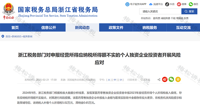 2024年9月,浙江税务部门根据税收大数据分析线索,发现某医药零售独资企业投资者申报2023年度经营所得个人所得税收入偏低,存在应纳税所得额不实疑点,对其进行风险提醒。该医药零售独资企业申报收入金额与医保实际刷卡金额存在较大差异,在税务机关风险提示和政策辅导后,该纳税人补缴个人所得税5.02万元、滞纳金0.65万元。