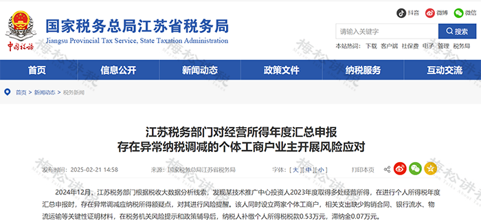 2024年12月,江苏税务部门根据税收大数据分析线索,发现某技术推广中心投资人2023年度取得多处经营所得,在进行个人所得税年度汇总申报时,存在异常调减应纳税所得额疑点,对其进行风险提醒。该人同时设立两家个体工商户,相关支出缺少购销合同、银行流水、物流运输等关键性证明材料,在税务机关风险提示和政策辅导后,纳税人补缴个人所得税税款0.53万元,滞纳金0.07万元。