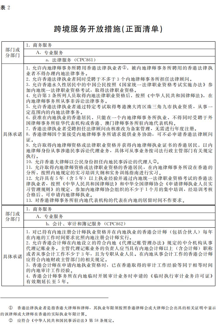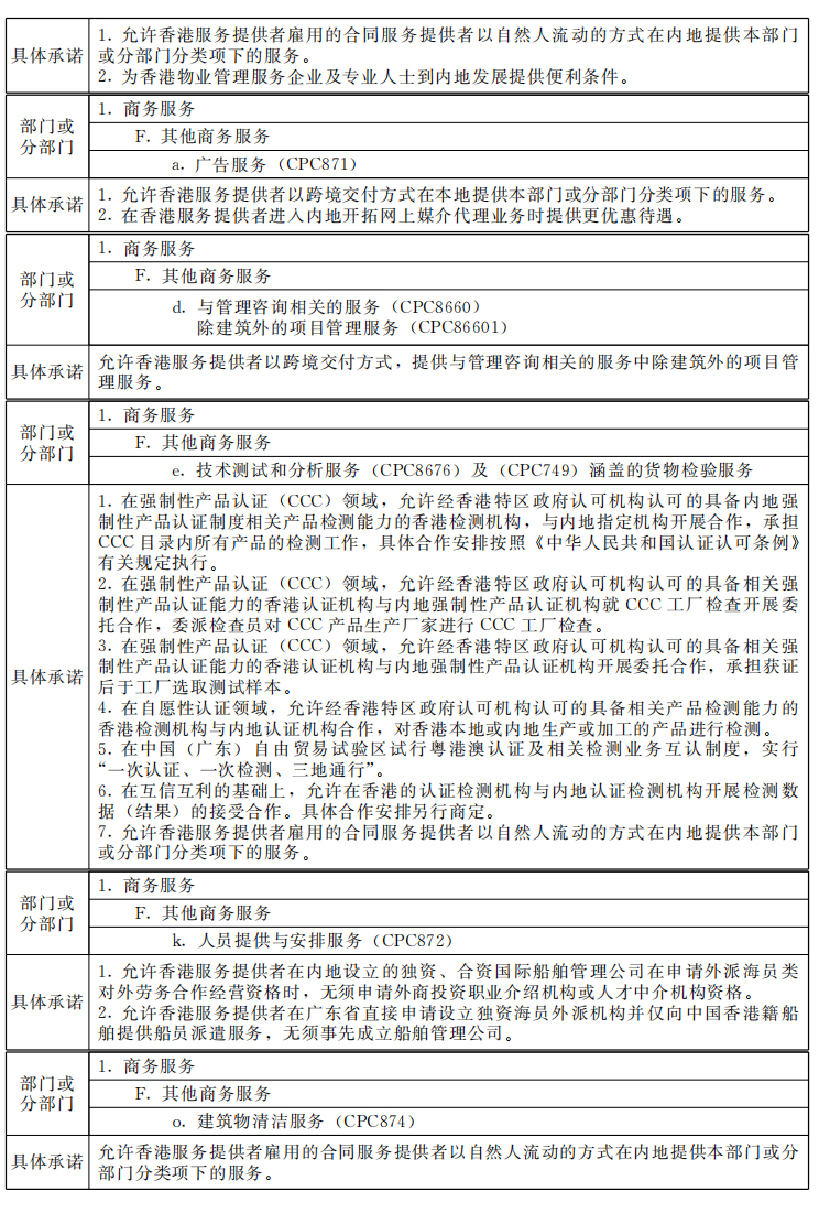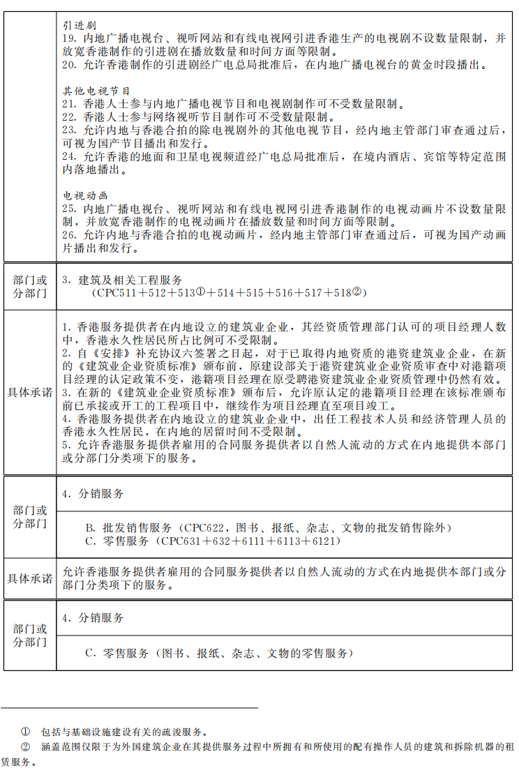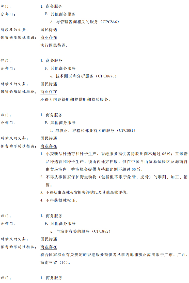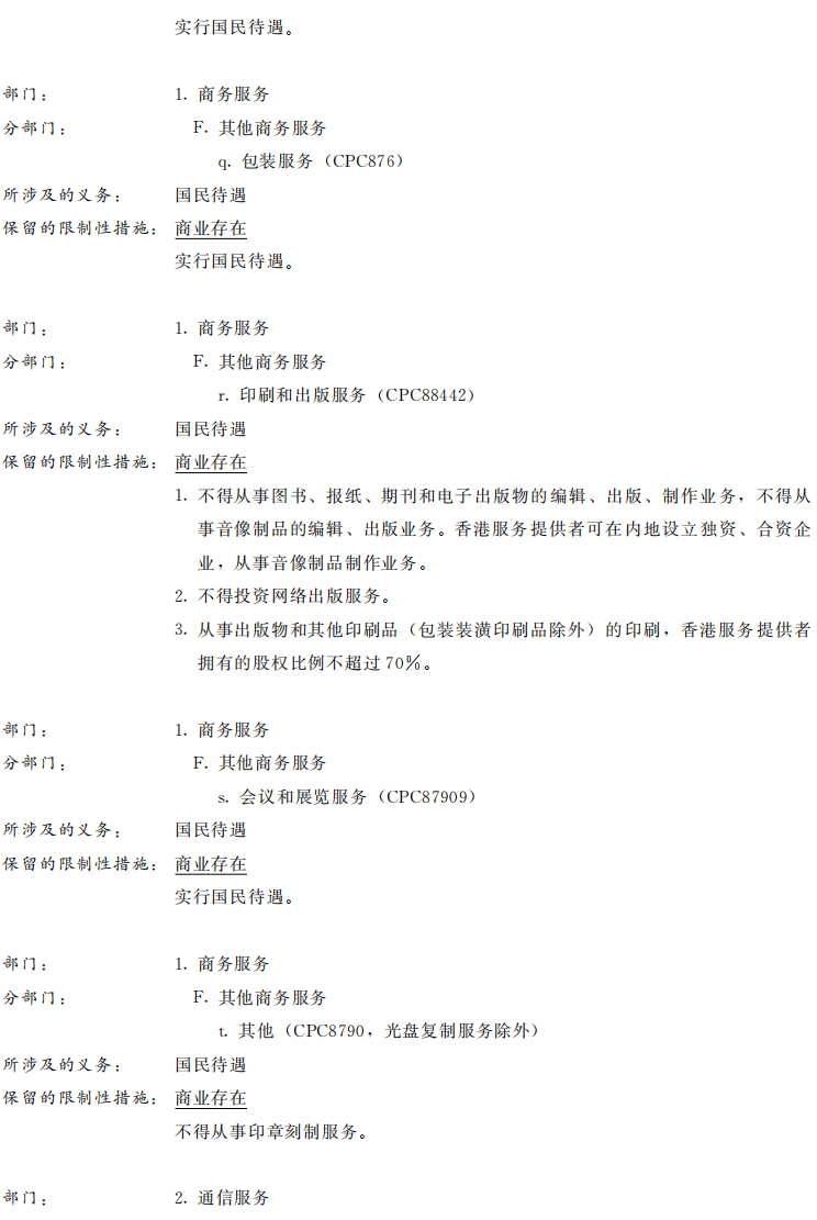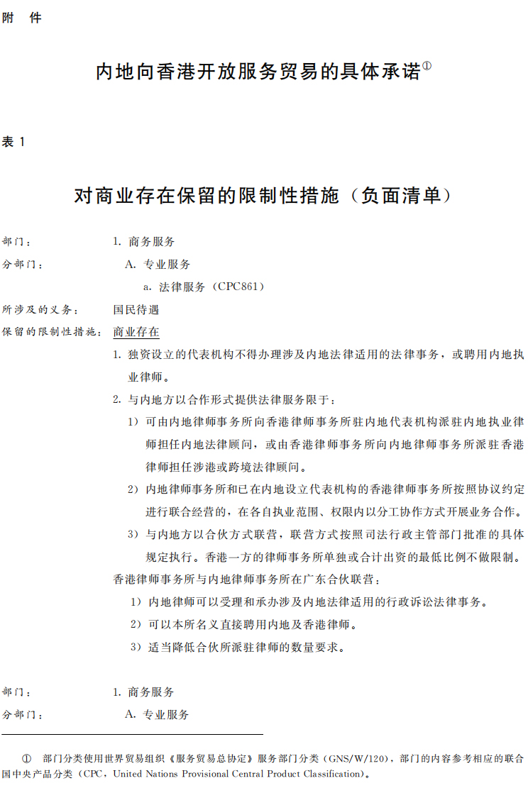 二、在《服务贸易协议》和《修订协议》的基础上进一步扩大内地对香港服务领域开放,对《服务贸易协议》附件1《内地向香港开放服务贸易的具体承诺》表1《对商业存在保留的限制性措施(负面清单)》进行缩减和修订,经进一步修订内容详见本协议附件表1。在跨境服务领域内地对香港增加新的开放措施,对《服务贸易协议》附件1表2《跨境服务开放措施(正面清单)》的进一步修订内容详见本协议附件表2。本协议附件表1和表2分别取代经《修订协议》修订的《服务贸易协议》附件1表1和表2。