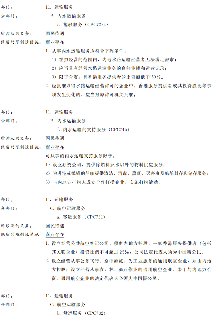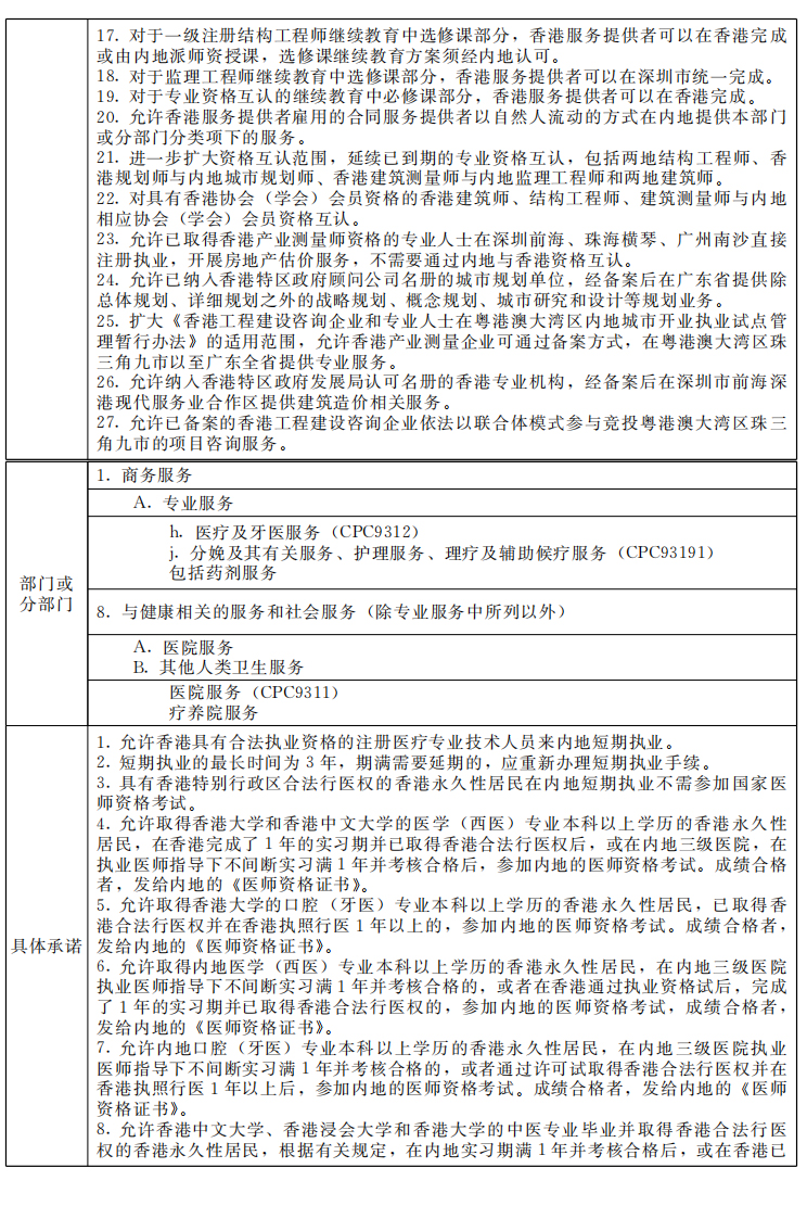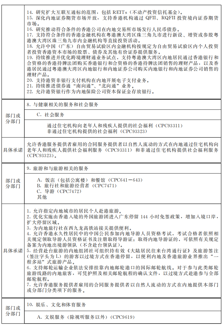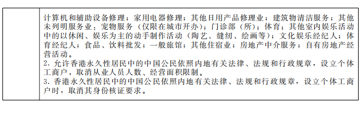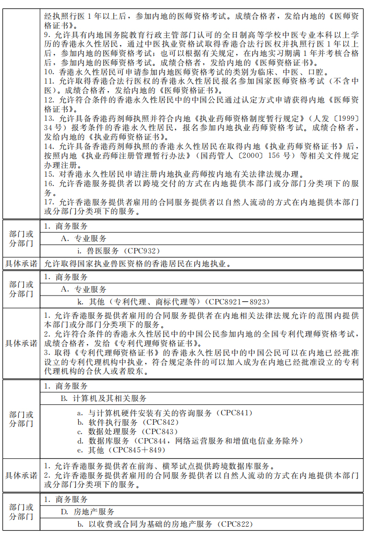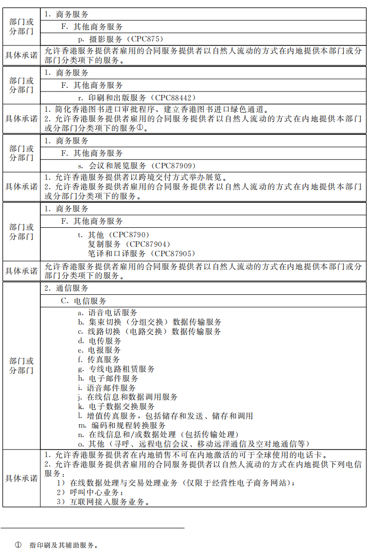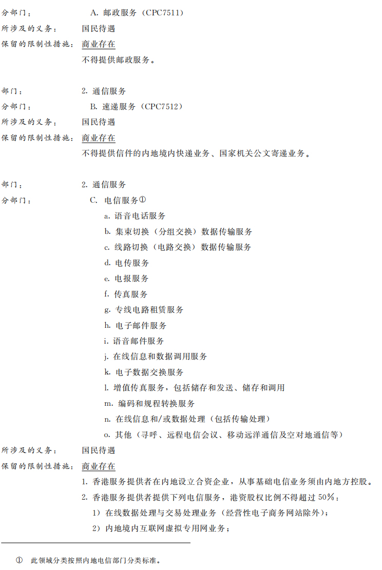 二、在《服务贸易协议》和《修订协议》的基础上进一步扩大内地对香港服务领域开放,对《服务贸易协议》附件1《内地向香港开放服务贸易的具体承诺》表1《对商业存在保留的限制性措施(负面清单)》进行缩减和修订,经进一步修订内容详见本协议附件表1。在跨境服务领域内地对香港增加新的开放措施,对《服务贸易协议》附件1表2《跨境服务开放措施(正面清单)》的进一步修订内容详见本协议附件表2。本协议附件表1和表2分别取代经《修订协议》修订的《服务贸易协议》附件1表1和表2。
