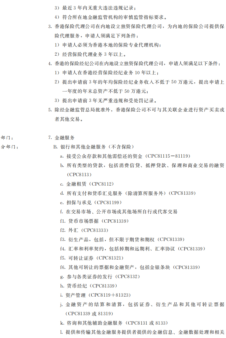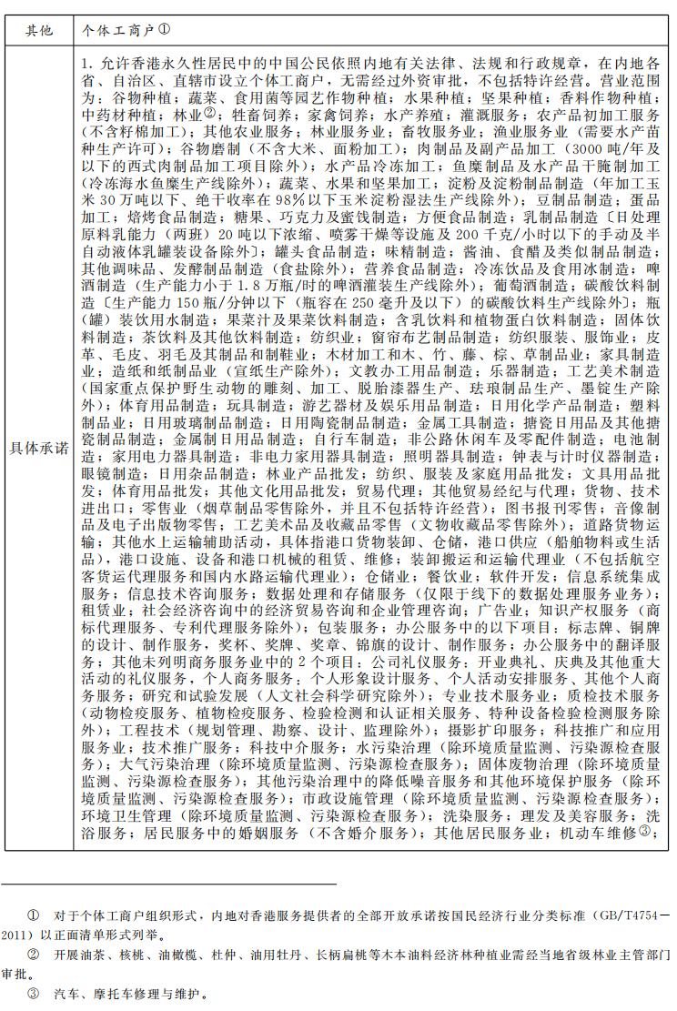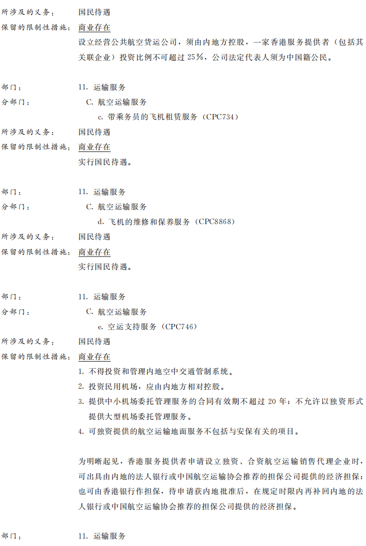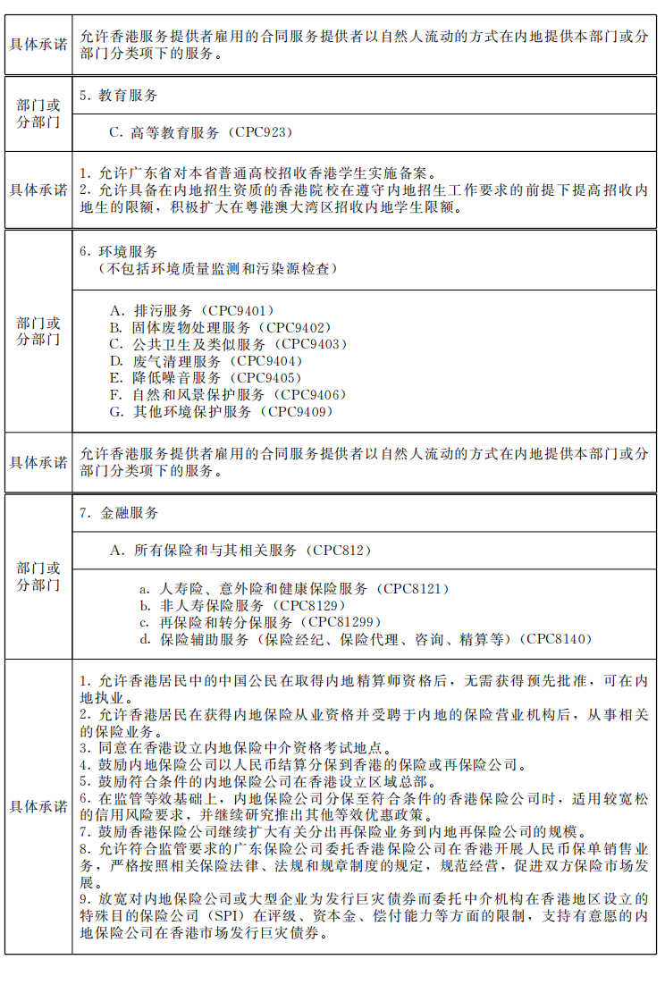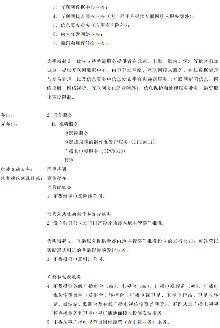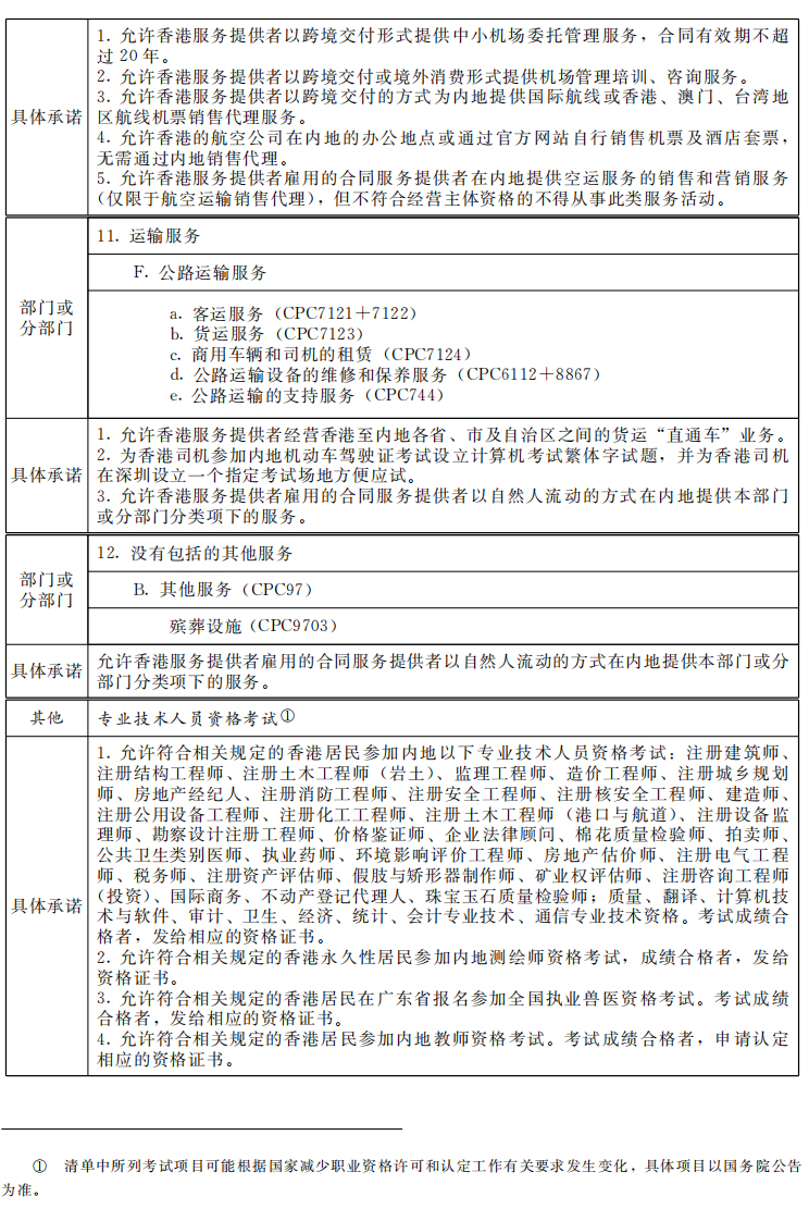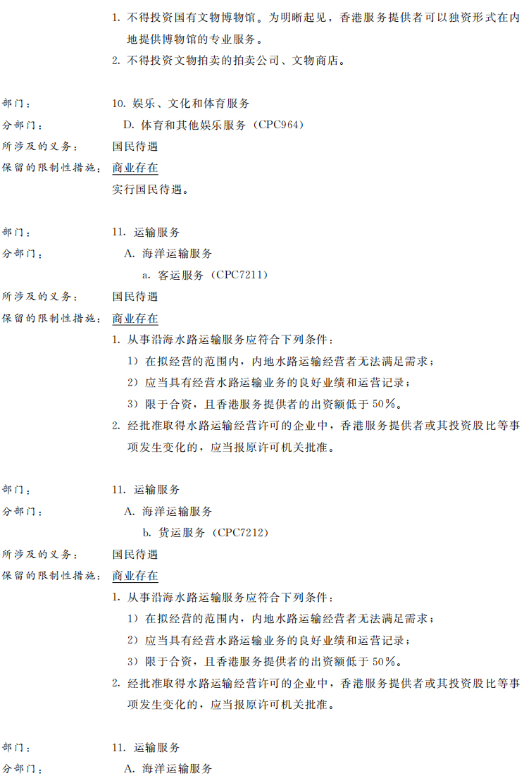 二、在《服务贸易协议》和《修订协议》的基础上进一步扩大内地对香港服务领域开放,对《服务贸易协议》附件1《内地向香港开放服务贸易的具体承诺》表1《对商业存在保留的限制性措施(负面清单)》进行缩减和修订,经进一步修订内容详见本协议附件表1。在跨境服务领域内地对香港增加新的开放措施,对《服务贸易协议》附件1表2《跨境服务开放措施(正面清单)》的进一步修订内容详见本协议附件表2。本协议附件表1和表2分别取代经《修订协议》修订的《服务贸易协议》附件1表1和表2。