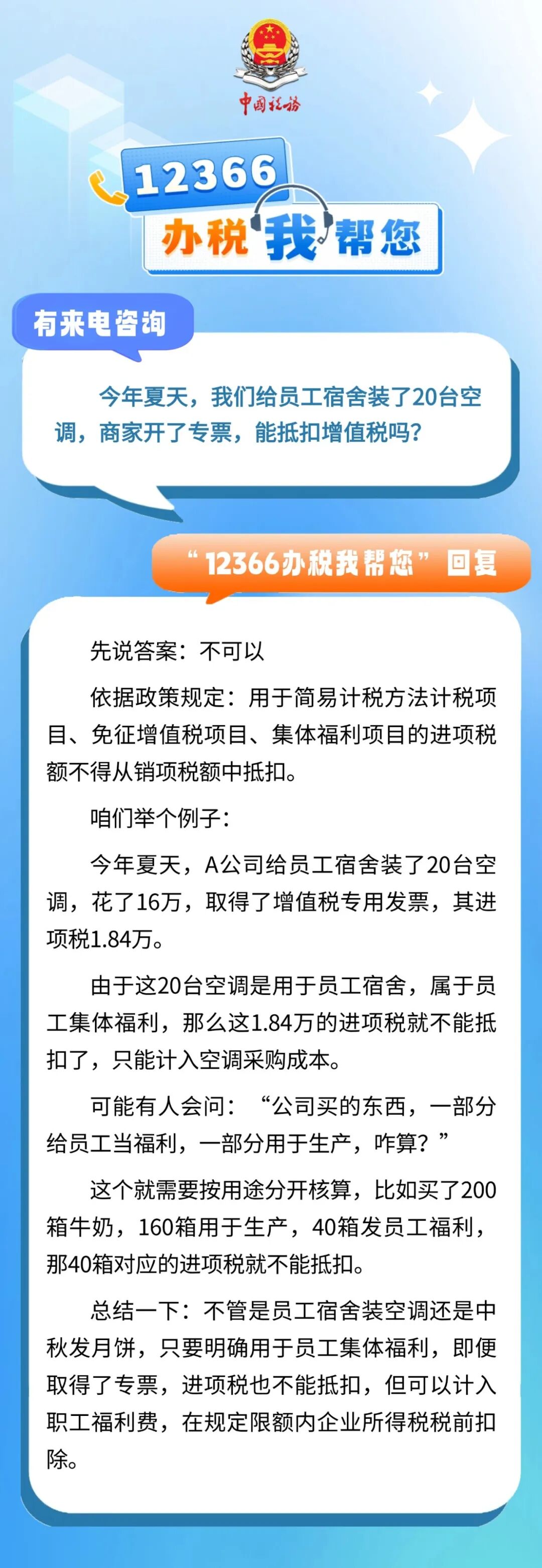 有来电咨询 :今年夏天,我们给员工宿舍装了20台空调,商家开了专票,能抵扣增值税吗?一起来看看回复吧↓