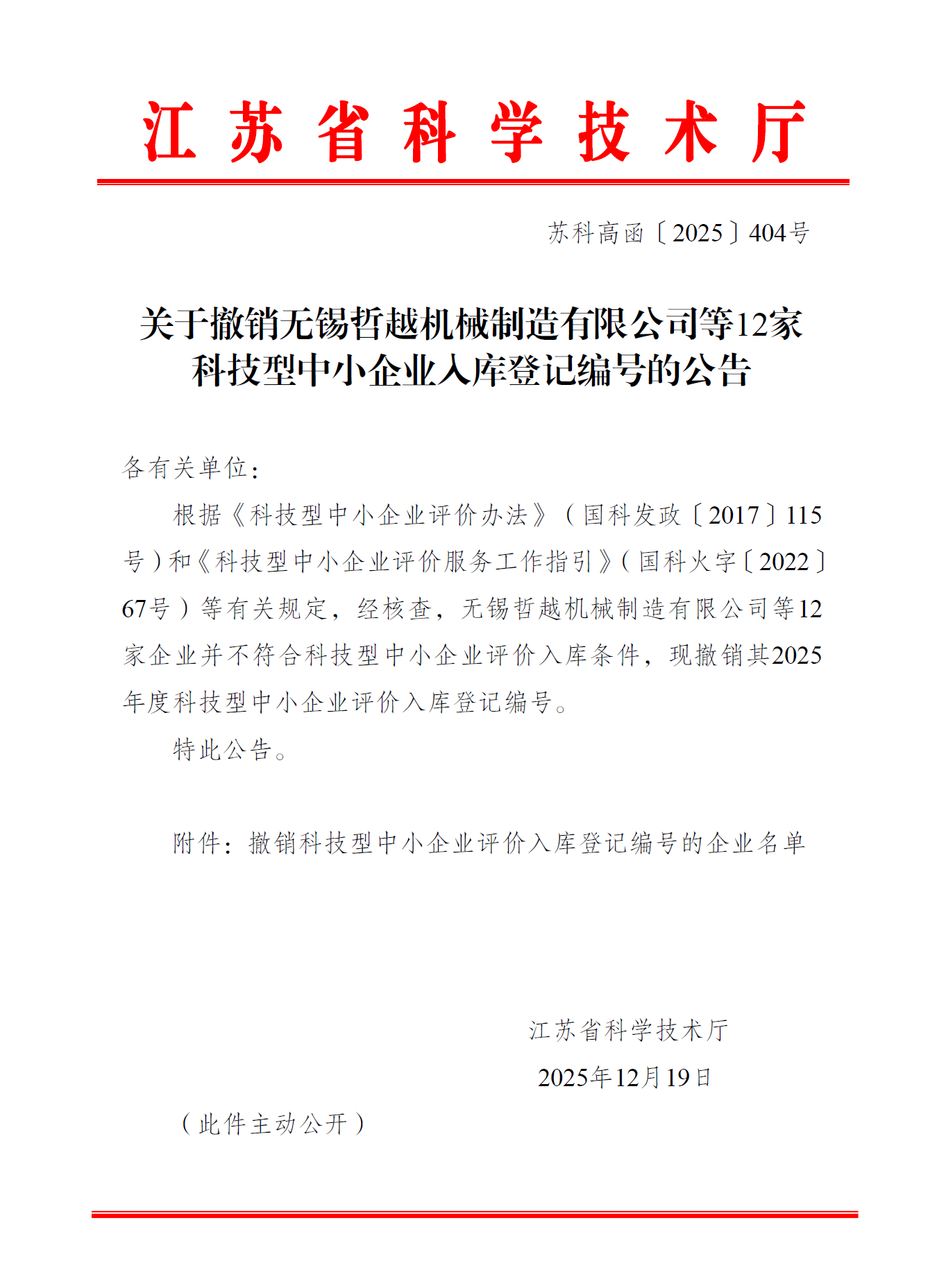 江苏省科学技术厅关于撤销无锡哲越机械制造有限公司等12家科技型中小企业入库登记编号的公告