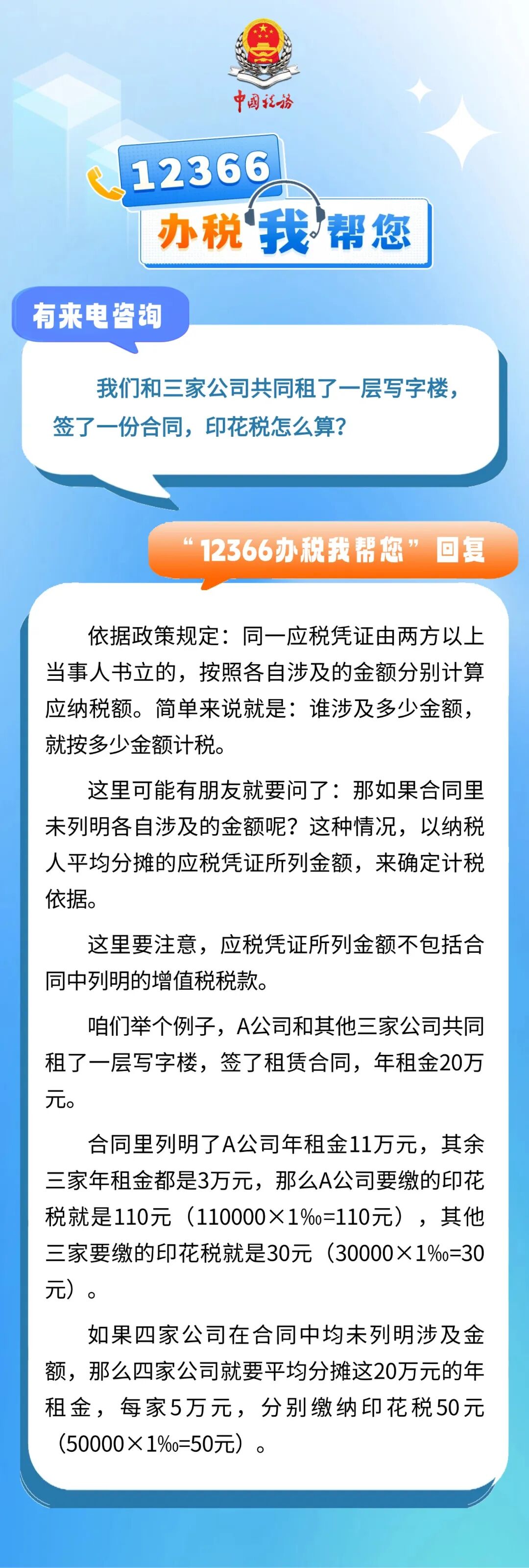 有来电咨询 :我们和三家公司共同租了一层写字楼,签了一份合同,印花税怎么算?一起来看看回复吧↓