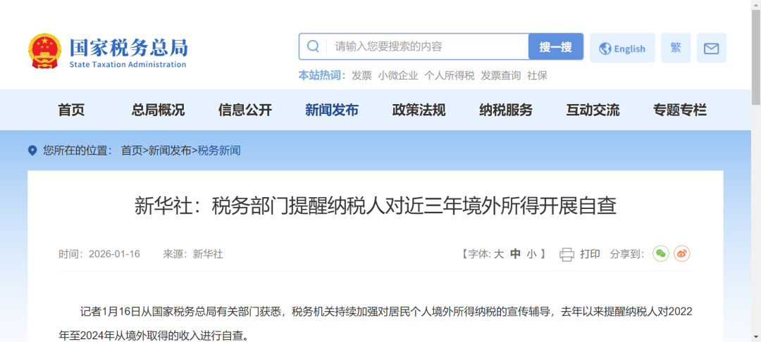 记者1月16日从国家税务总局有关部门获悉,税务机关持续加强对居民个人境外所得纳税的宣传辅导,去年以来提醒纳税人对2022年至2024年从境外取得的收入进行自查。