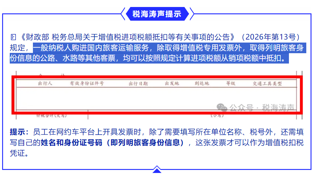之所以产生这个问题的主要缘由是,根据2026年起施行的13号公告的规定,取得列明旅客身份信息的公路、水路等其他客票,是按公式计算进项税额,“可抵扣进项税额=票面金额÷(1+3%)×3%”。