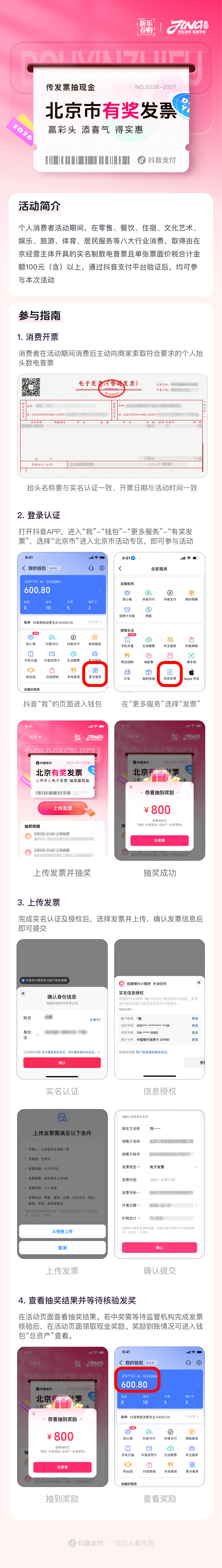 以北京为例,北京有奖发票参与可通过银联云闪付、支付宝、微信支付、京东支付、抖音支付等渠道,进入“有奖发票”页面或小程序,然后在活动页面上传发票信息就能参与抽奖。最高奖金800元,还有200、100、50、10元不等奖金,奖金以电子红包形式在10个工作日内兑付至参与渠道的个人支付账户,可随心消费。