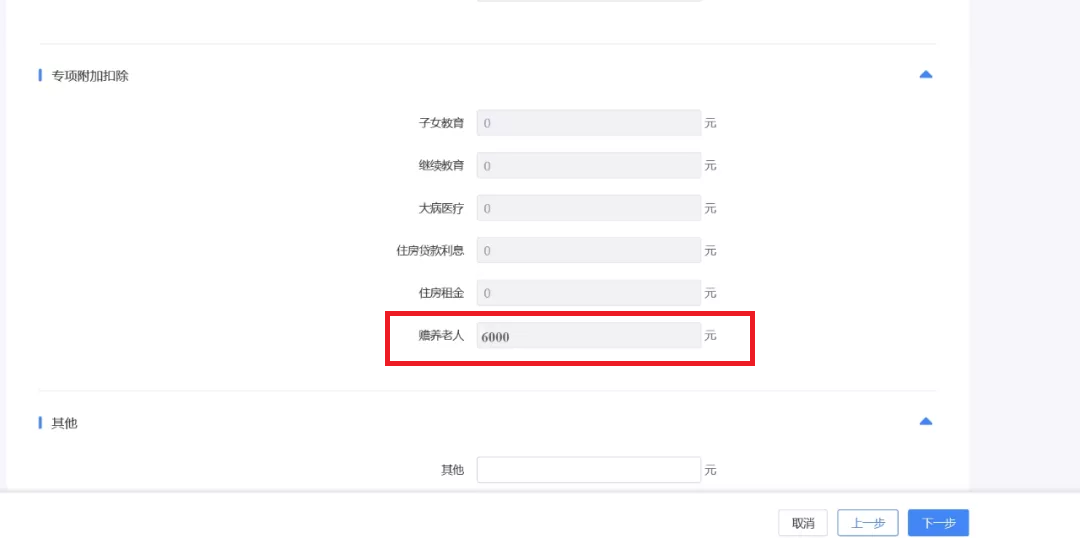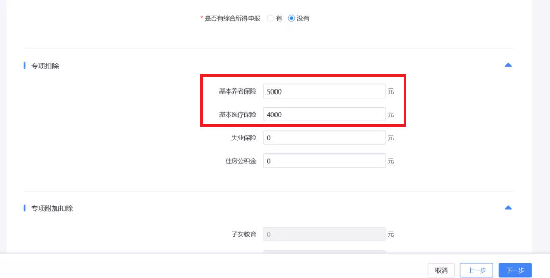 以上述案例为例,您需要在“基本养老保险”中填入5000,“基本医疗保险”中填入4000,“赡养老人”中填入6000。