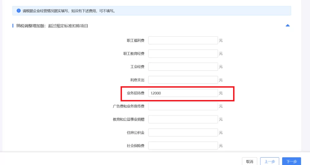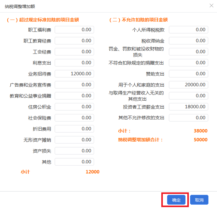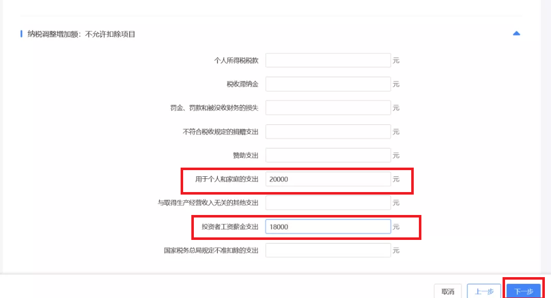 以上述案例为例,您需要在“业务招待费”中调增12000,“用于个人和家庭的支出”中调增20000,“投资者工资薪金支出”中调增18000。