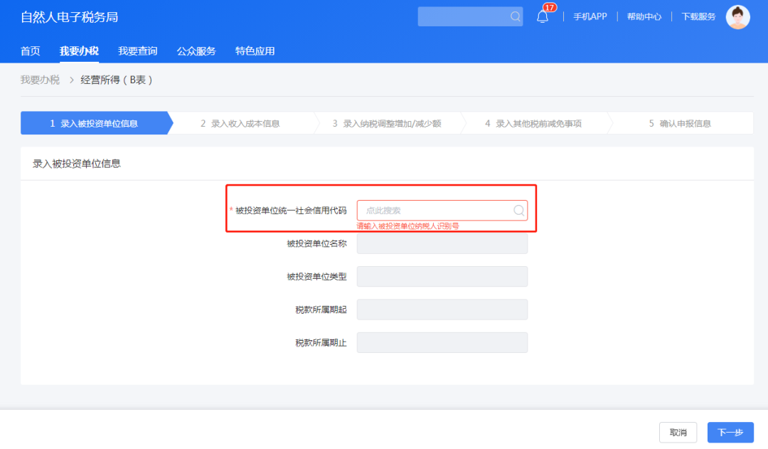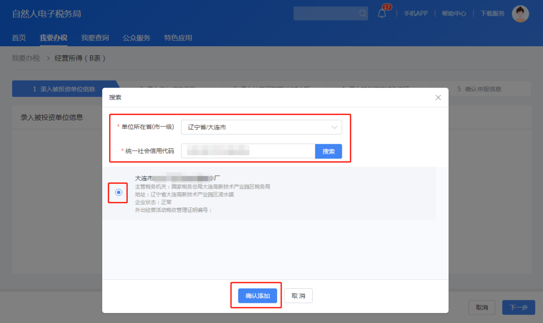 点击“被投资单位统一社会信用代码”框,选择“单位所在省(市一级)”,录入“统一社会信用代码”,选中对应企业,点击“确认添加”。
