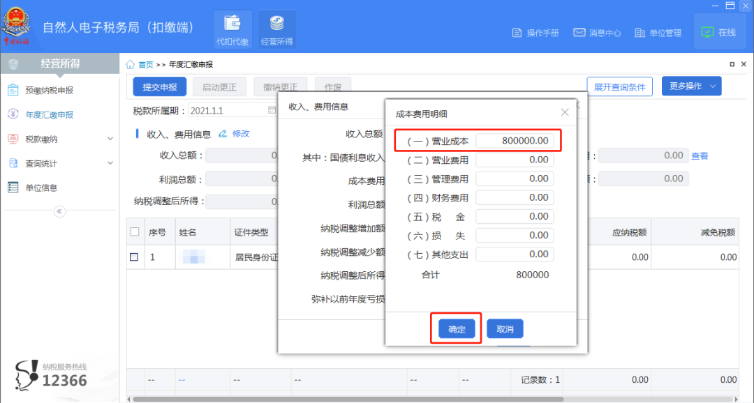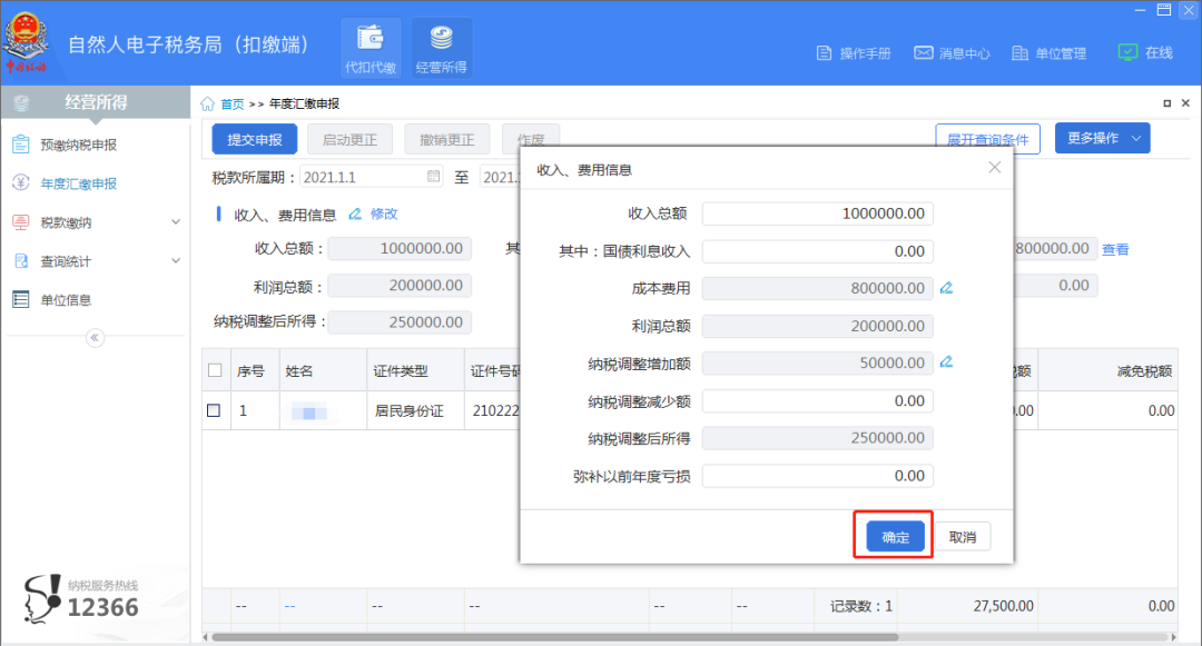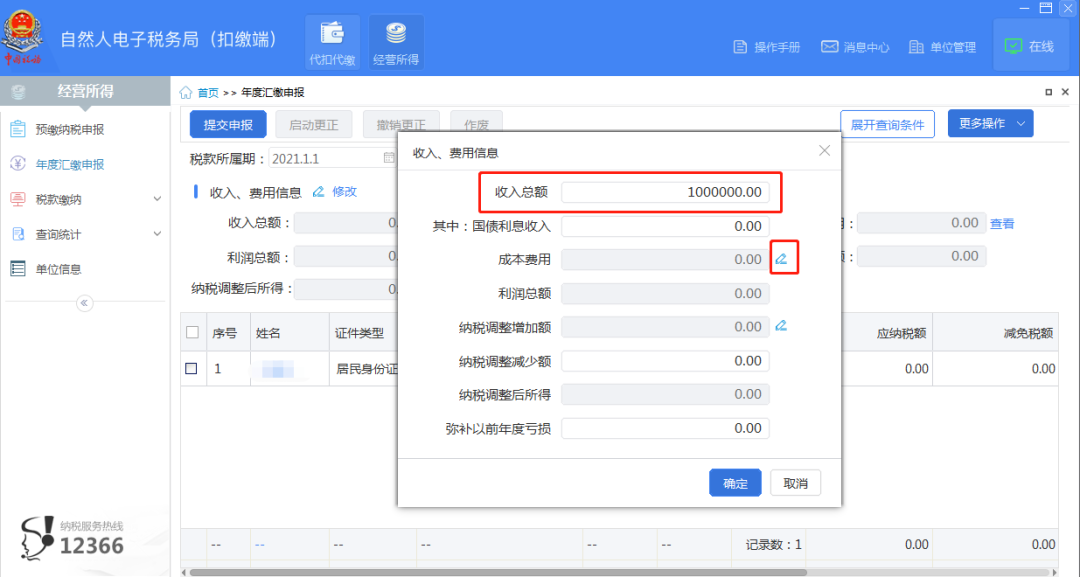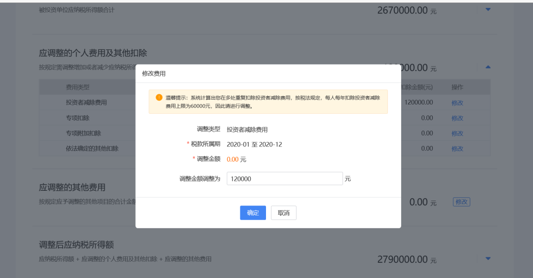 点击“修改”按钮,填写收入、成本费用及纳税调整增加额信息,完成后点击“确定”。