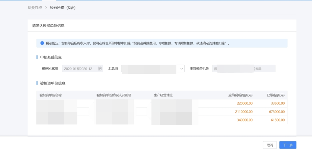 以上述案例为例,系统会自动带出您所有被投资单位的应纳税所得额和已缴税款。