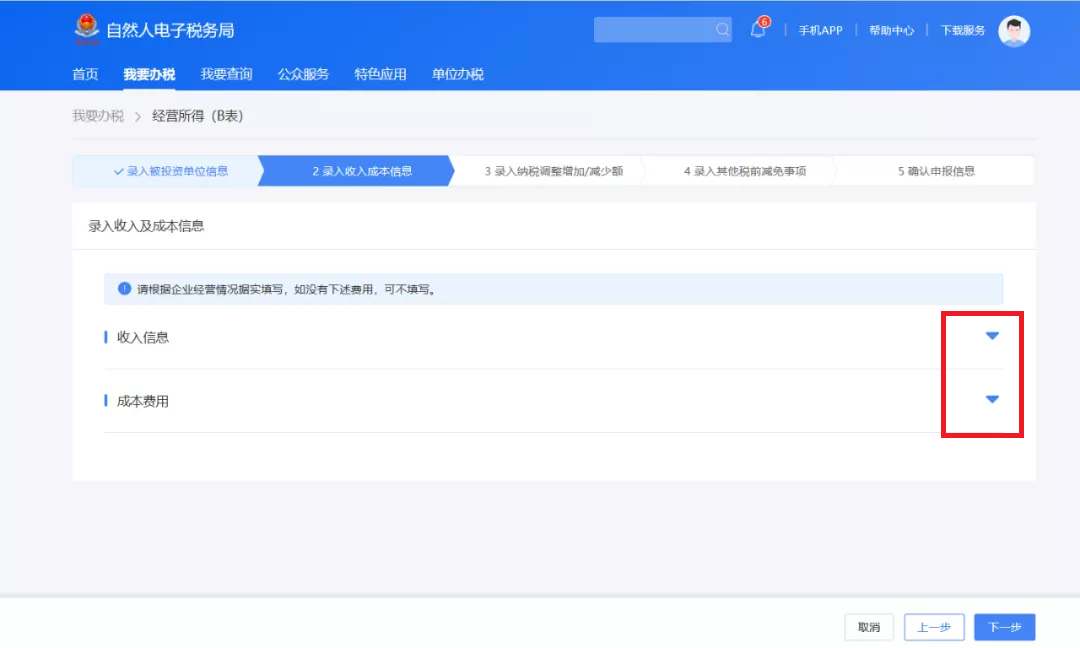 点击下拉按钮,依次录入“收入信息”和“成本费用”,点击“下一步”。