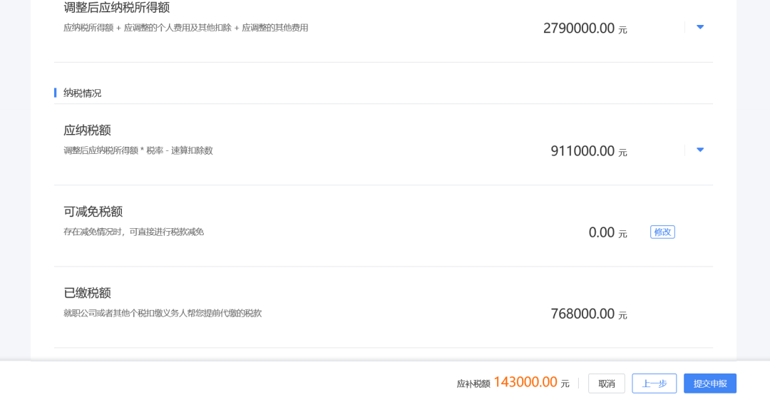 确认申报信息,系统会自动为您计算出应补税款或应退税款,确认无误后,点击“提交”。