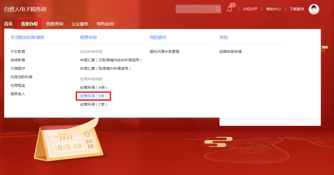 点击“我要办税-税费申报-经营所得(B表)”。