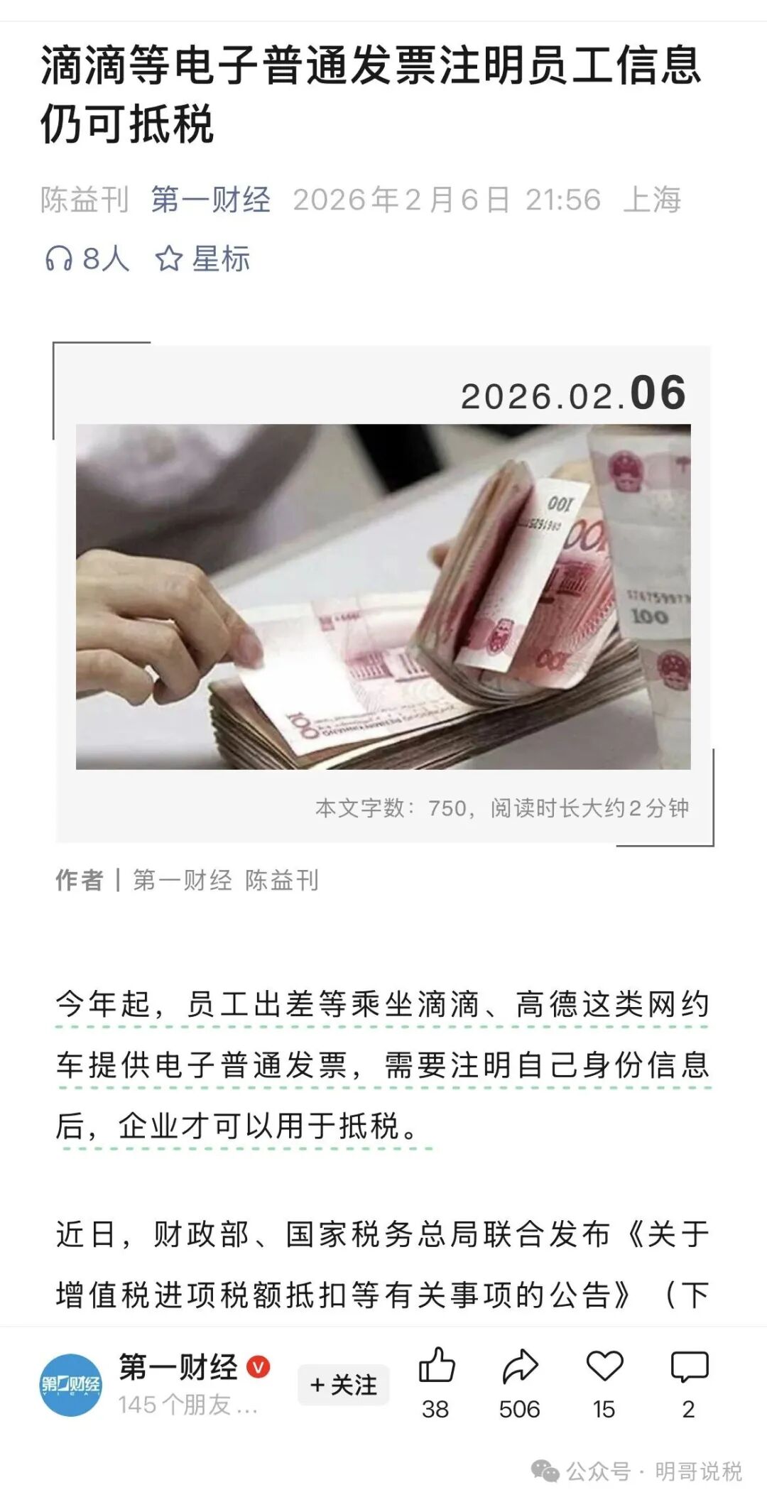 今年起,员工出差等乘坐滴滴、高德这类网约车提供电子普通发票,需要注明自己身份信息后,企业才可以用于抵税。