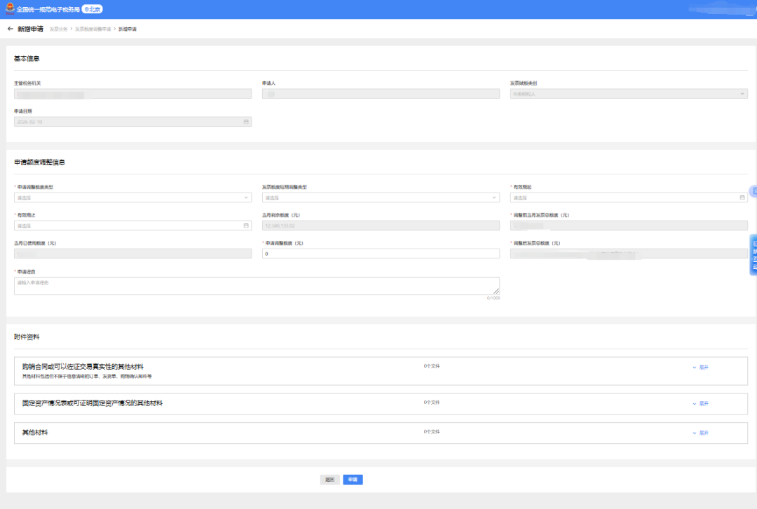 点击【新增申请】按钮,弹出发票额度新增申请页面,填写发票额度调整申请相关信息,上传相关附件资料即可提交本次调整申请记录。