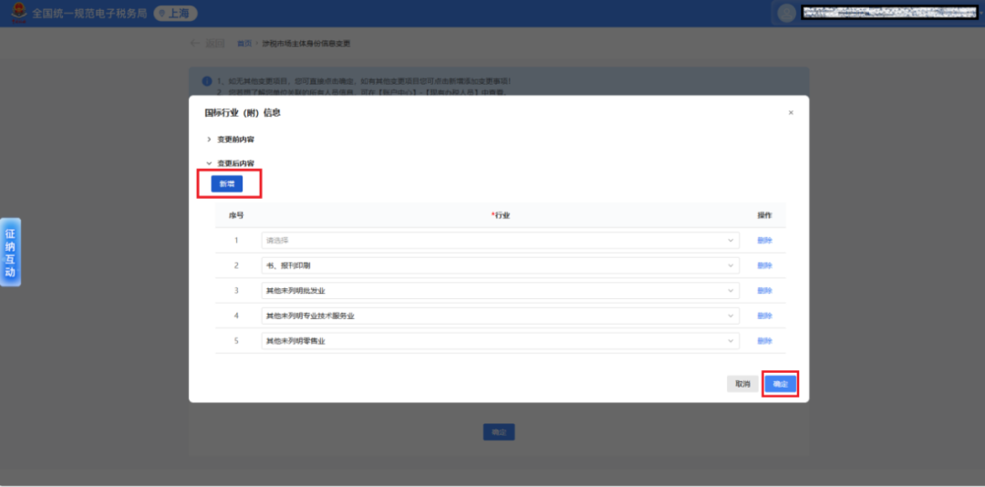 选定【国标行业(附)】后,在“变更后内容”处点击【新增】,选择需要增加的行业,点击【确定】即可。系统提示"保存成功"后,即完成信息添加。