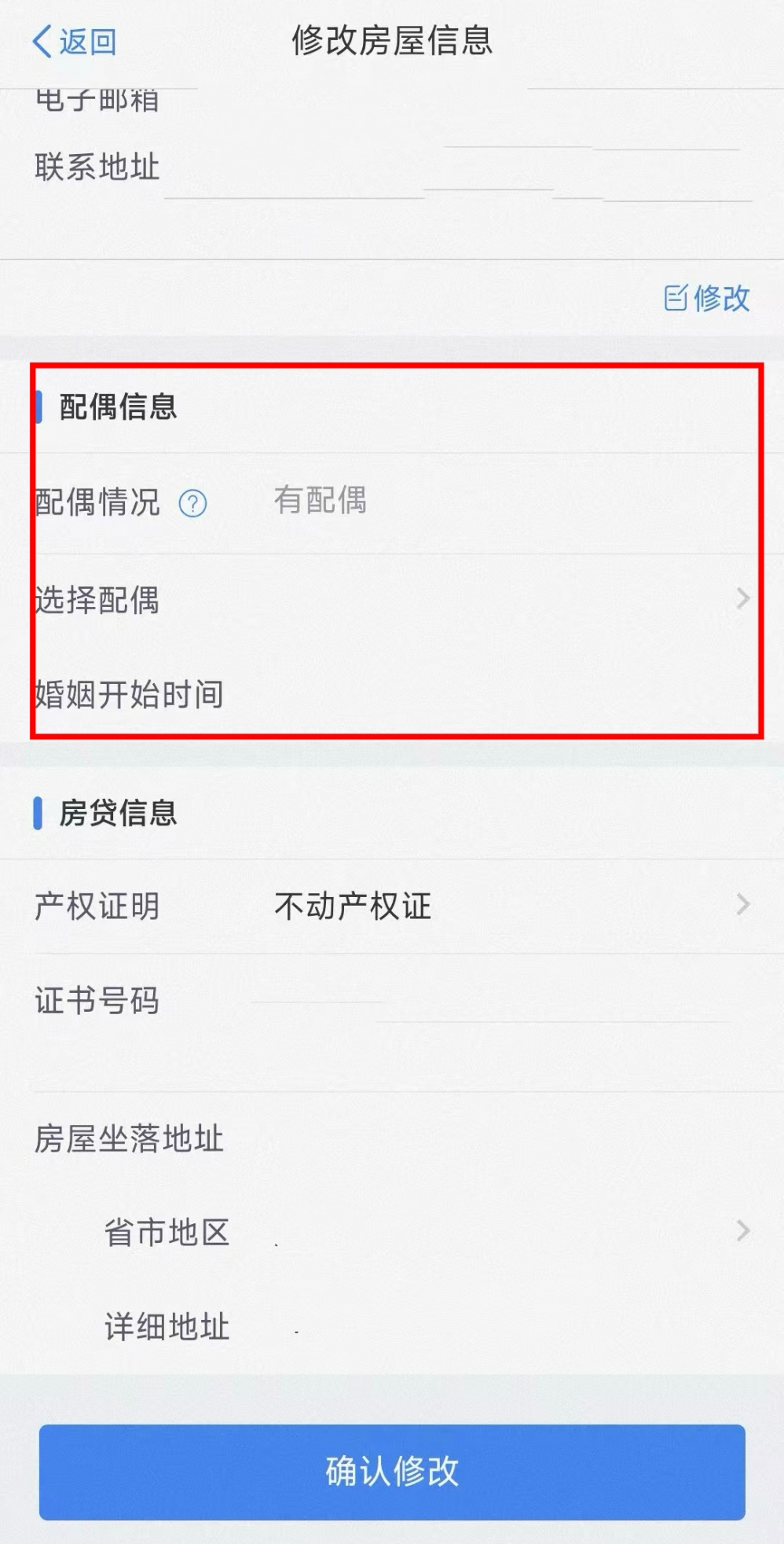 系统会自动将“配偶情况”修改为【有配偶】,并带入已采集的配偶信息,如无其他需修改的信息,点击【确认修改】即完成修改。