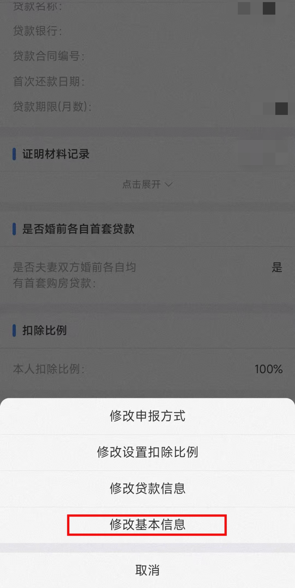 以住房贷款利息为例,点击首页【专项附加扣除】模块的【我要查询】——点击查询扣除年度的“住房贷款利息”专项附加扣除——点击底部【修改】——选择“修改基本信息”。