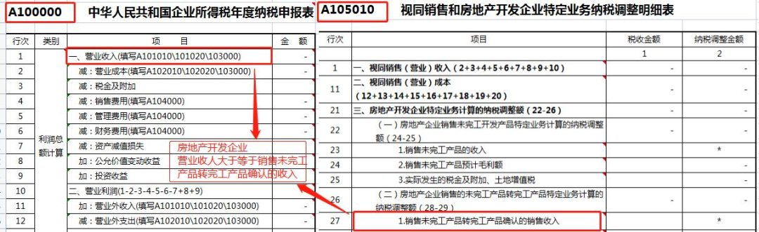 一般情况下,房地产开发企业年度纳税申报表主表(A100000)第1行“营业收入”应大于或等于《视同销售和房地产开发企业特定业务纳税调整明细表》(A105010)第27行“销售未完工产品转完工产品确认的销售收入”金额。