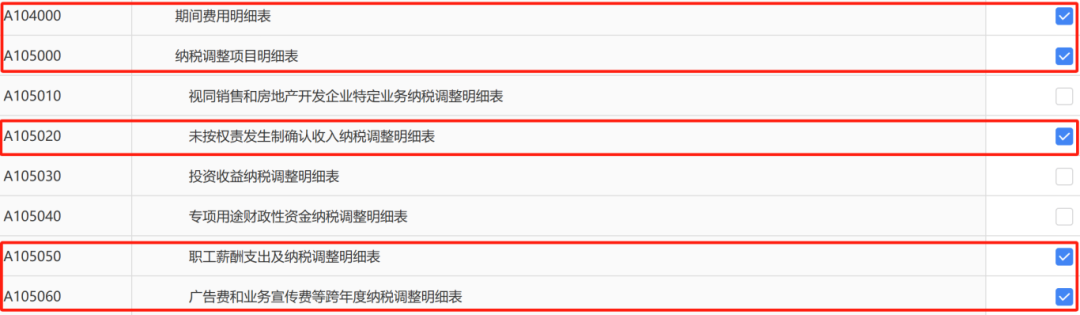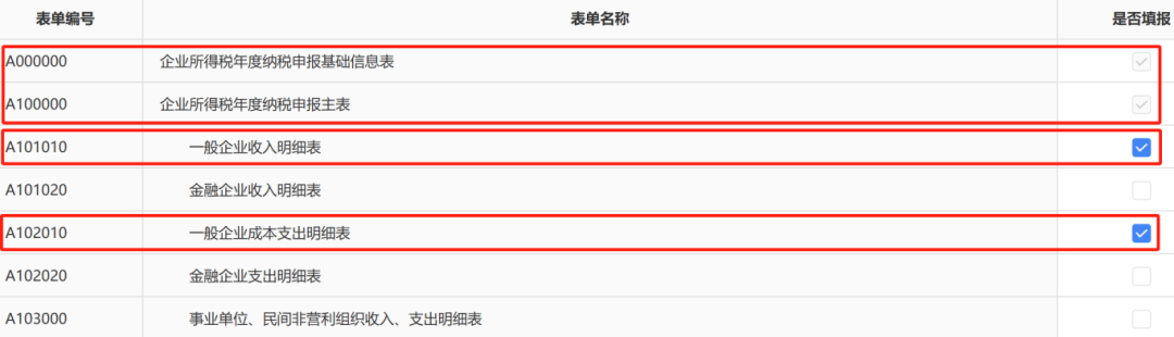 系统逻辑:根据A000000表信息自动勾选必填表,但需手动补充(如研发企业加选A107012表等)。