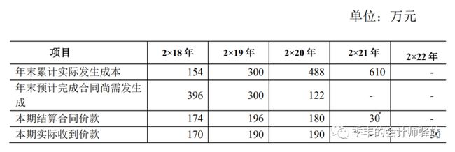 【例】甲建筑公司与其客户签订一项总金额为580万元的固定造价合同,该合同不可撤销。甲公司负责工程的施工及全面管理,客户按照第三方工程监理公司确认的工程完工量,每年与甲公司结算一次;该工程已于2×182月开工,预计2×216月完工;预计可能发生的工程总成本为550万元。到2×19年底,由于材料价格上涨等因素,甲公司将预计工程总成本调整为600万元。2×20年末根据工程最新情况将预计工程总成本调整为610万元。假定该建造工程整体构成单项履约义务,并属于在某一时段内履行的履约义务,该公司采用成本法确定履约进度,不考虑其他相关因素。该合同的其他有关资料如表所示。