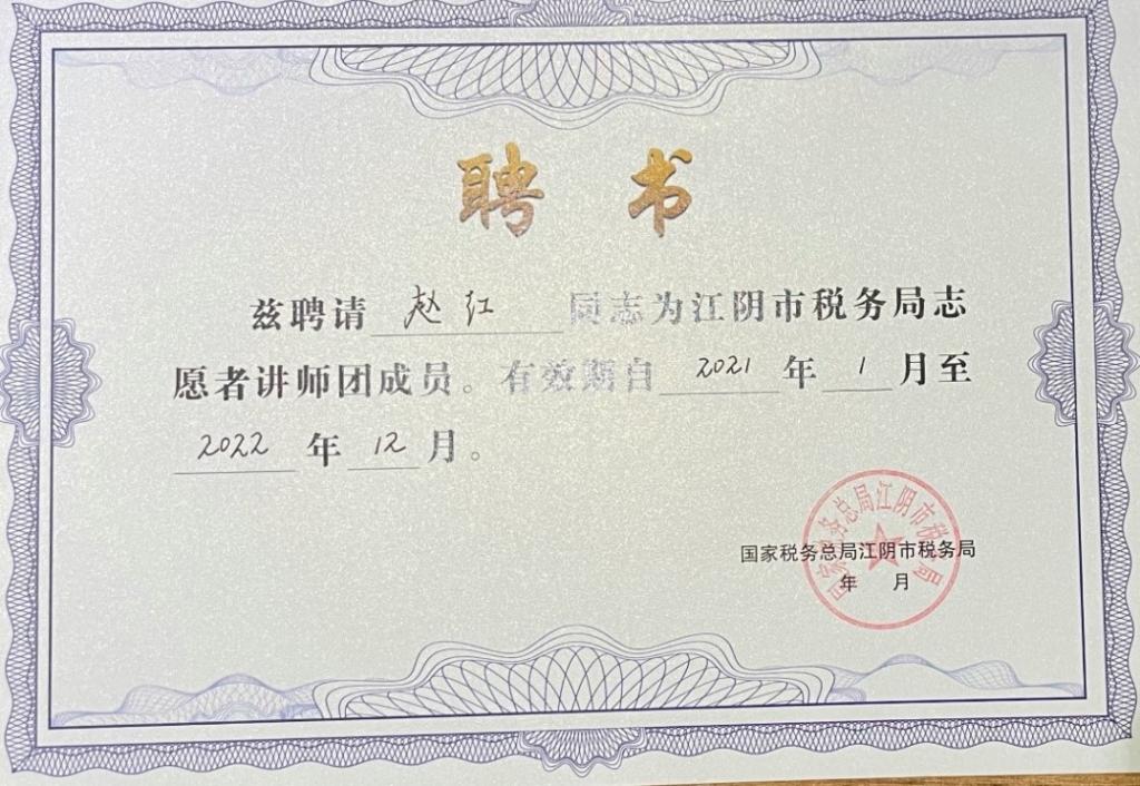 本所高级合伙人赵红经理受聘为江阴市税务局志原者讲师团成员。赵红经理为江阴市税务局纳税人学堂主讲了多期公益课程,课程中能将财税政策与自身实操案例与专业经验完美结合,内容有深度,具有落地性,语言表达通俗易懂,深受广大学员的好评,受到税务纳税服务部门的认可。