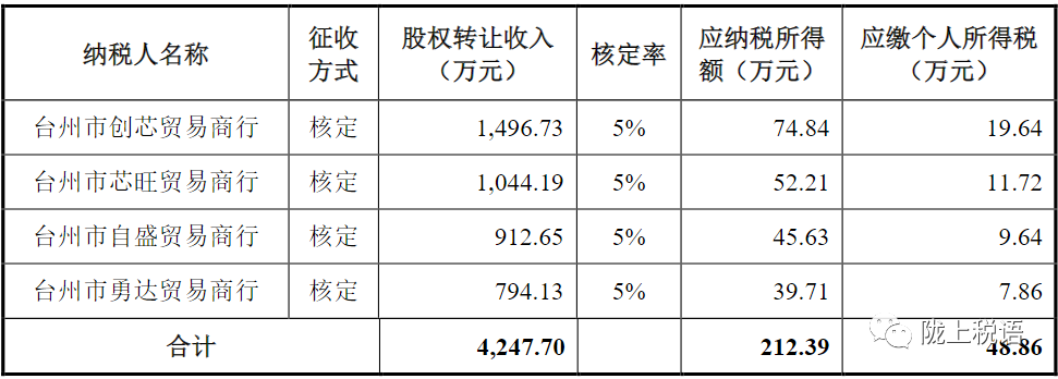 台州市芯旺贸易商行、台州市自盛贸易商行、台州市勇达贸易商行、台州市创芯贸易商行在进行上述股权转让时,按照5%的征收率核定了应纳税所得额,相关税款缴纳情况如下: