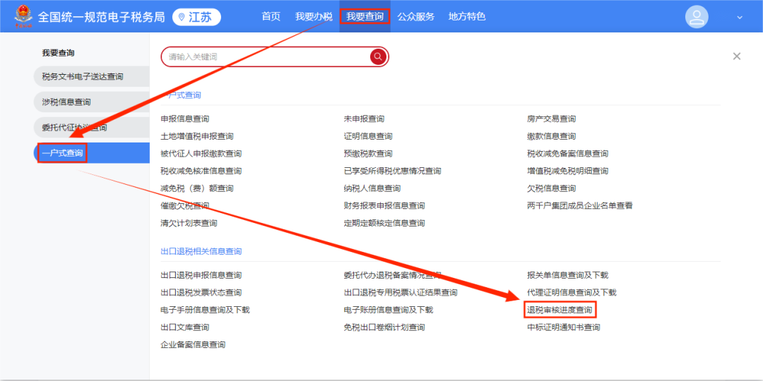出口企业完成免抵退税申报或免退税申报且税务机关审核通过后,可点击【我要查询】-【一户式查询】-【退税审核进度查询】,通过此模块查询下载《税务事项通知书》。