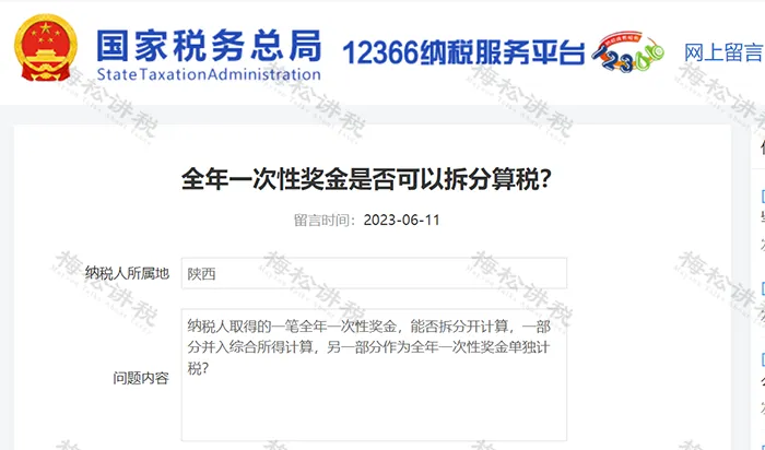 3 、我有一笔年终奖,分别在上半年和下半年发放,能不能合起来算作“全年一次性奖金”?