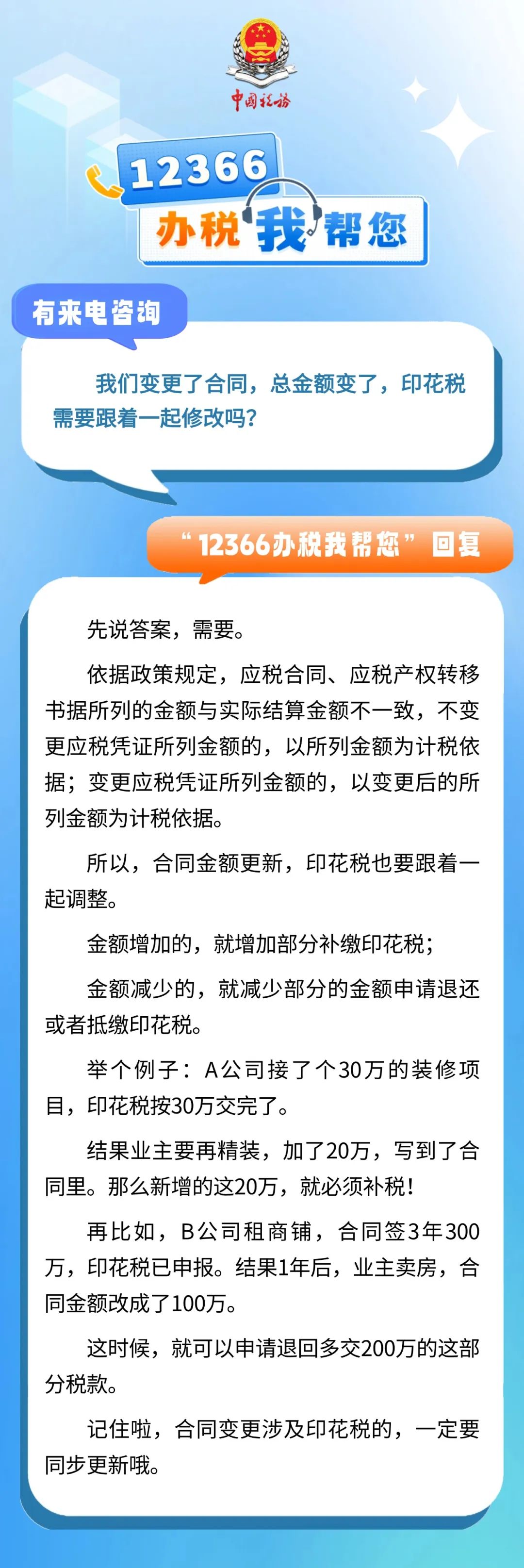 有来电咨询 :我们变更了合同,总金额变了,印花税需要跟着一起修改吗?一起来看看回复吧↓
