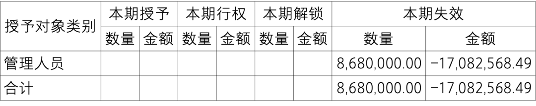 第六十一条 公司应按授予对象类别披露本期授予、行权、解锁和失效的各项权益工具数量和金额,期末发行在外的股票期权或其他权益工具行权价格的范围和合同剩余期限。