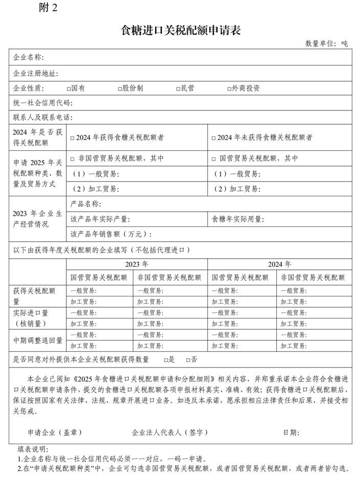2025年食糖进口关税配额总量为194.5万吨,其中70%为国营贸易关税配额。实施关税配额管理的食糖税目见附1。